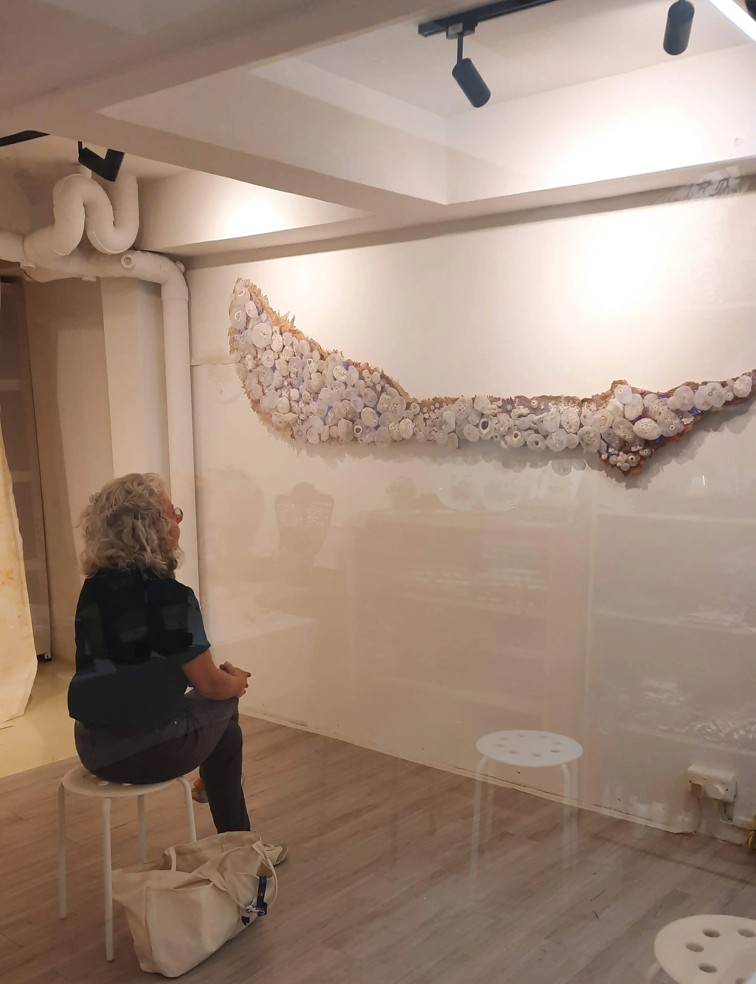 One particular visit moved me. I was immensely touched by Y who felt a personal connection with the coral art wall mural, Bleached. She looked at the installation up-close before taking a few steps back and spending more than 15 minutes, allowing the art piece to stimulate her senses. She said she felt an immense feeling of calm, yet also vulnerability when looking at the textile art piece. Engaging in sincere conversations, hearing all your interpretations, and discovering your personal connections to my art all brought levels of significance and complexity to the overall experience. Thank you so much!