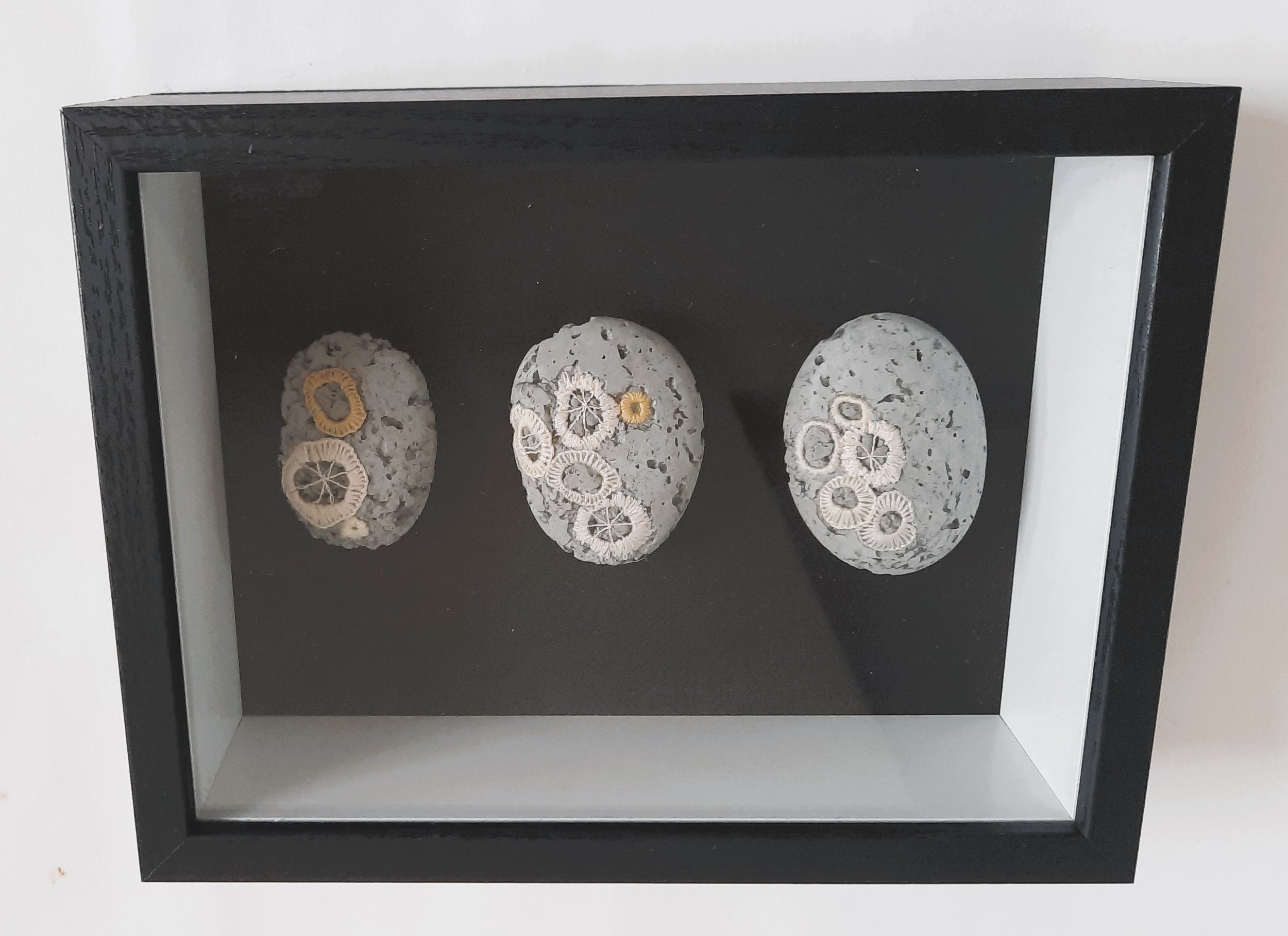Three sets are framed in a shadow box reminiscent of scientific specimens. These pieces were displayed as part of the Hues of Loss exhibition in 2023, and were part of the Relics series.