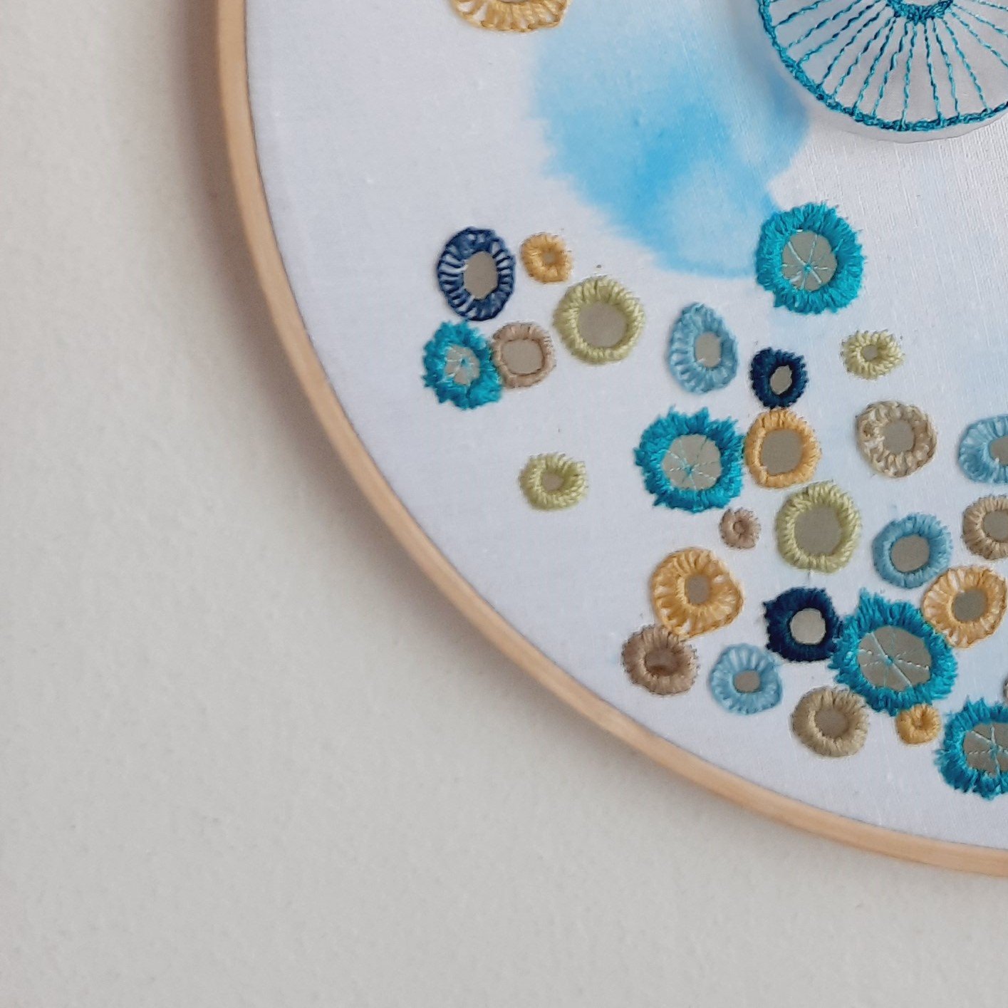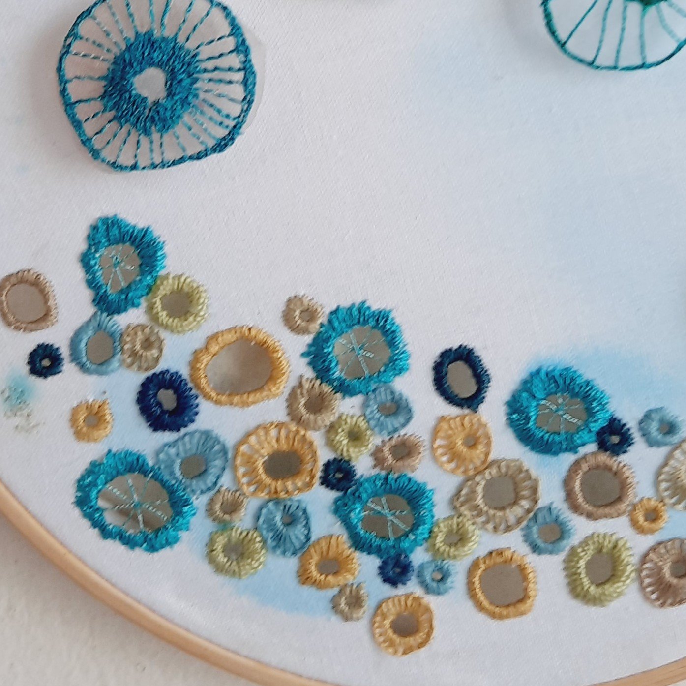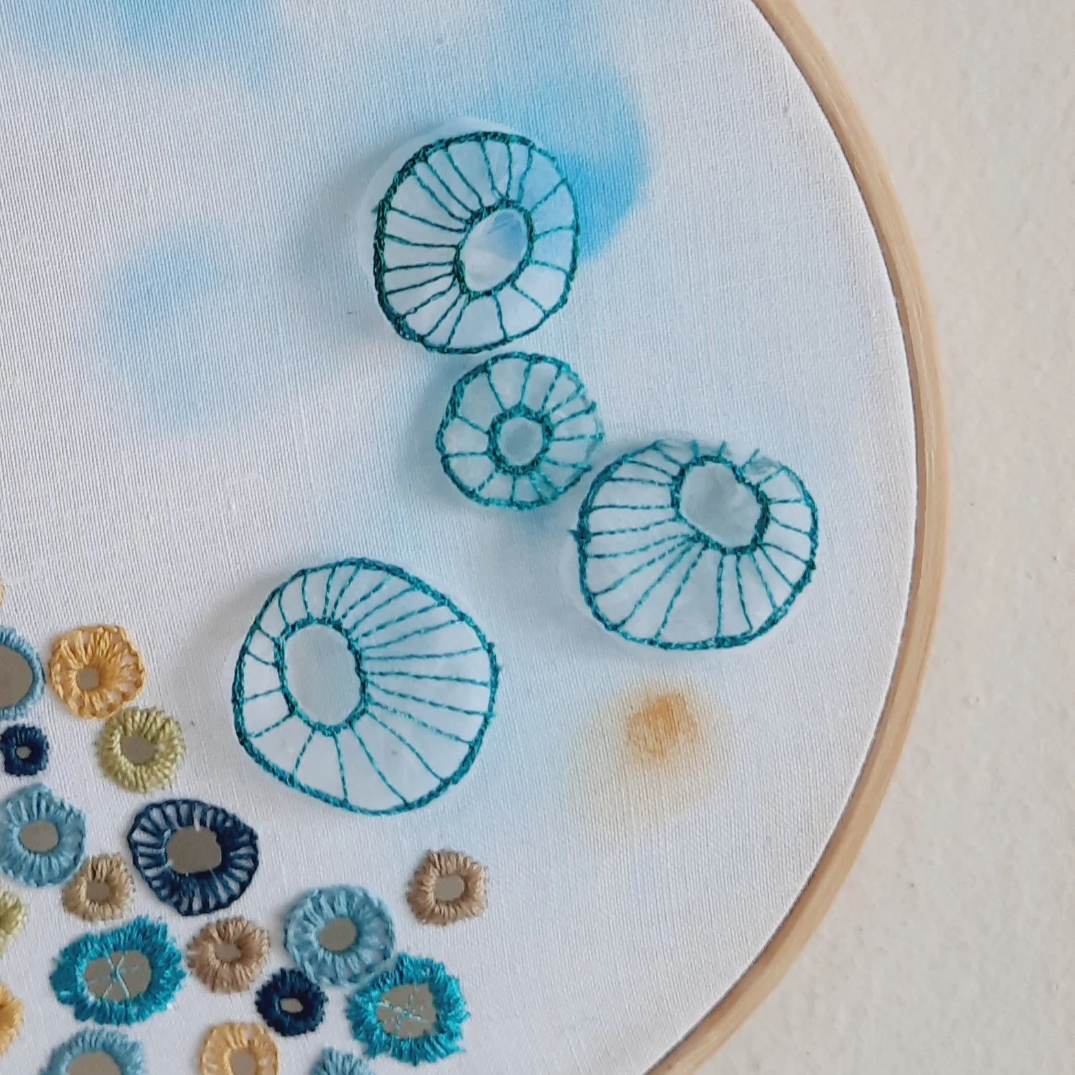 Unveiling Coral Reefs' Precarious Existence. Immerse yourself in the world of constrained and fragile coral environments, battling various human-induced threats. Agy combines handwork and sewing machine artistry through the Broderie Anglaise method, capturing the essence of coral clusters. The smaller scale symbolizes the drastic decline of coral reefs and the urgency to protect these invaluable ecosystems.