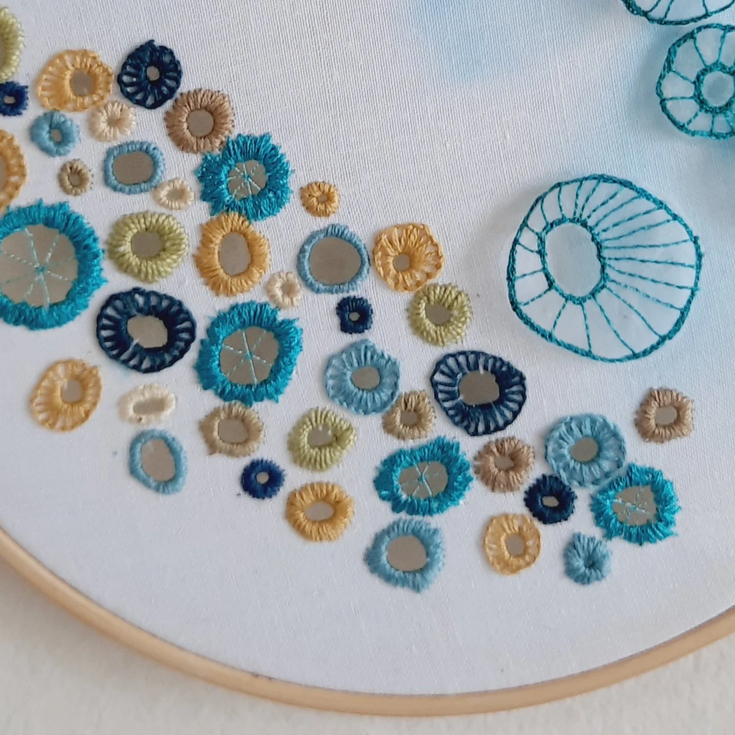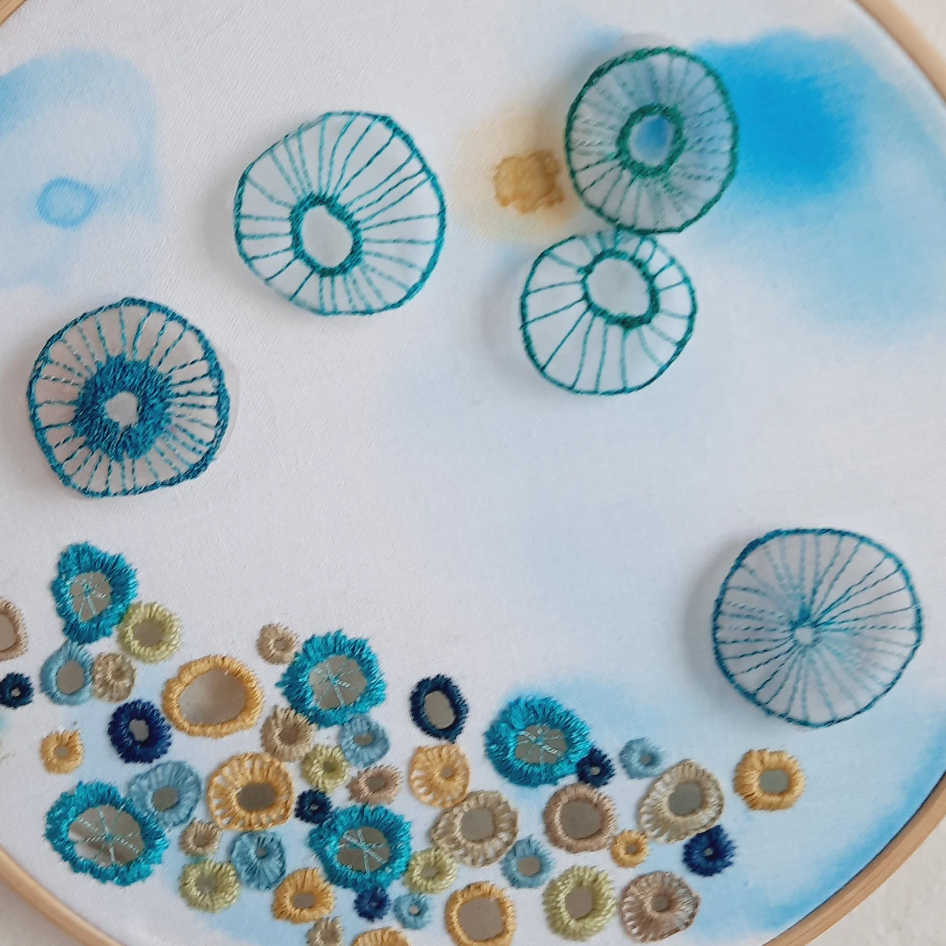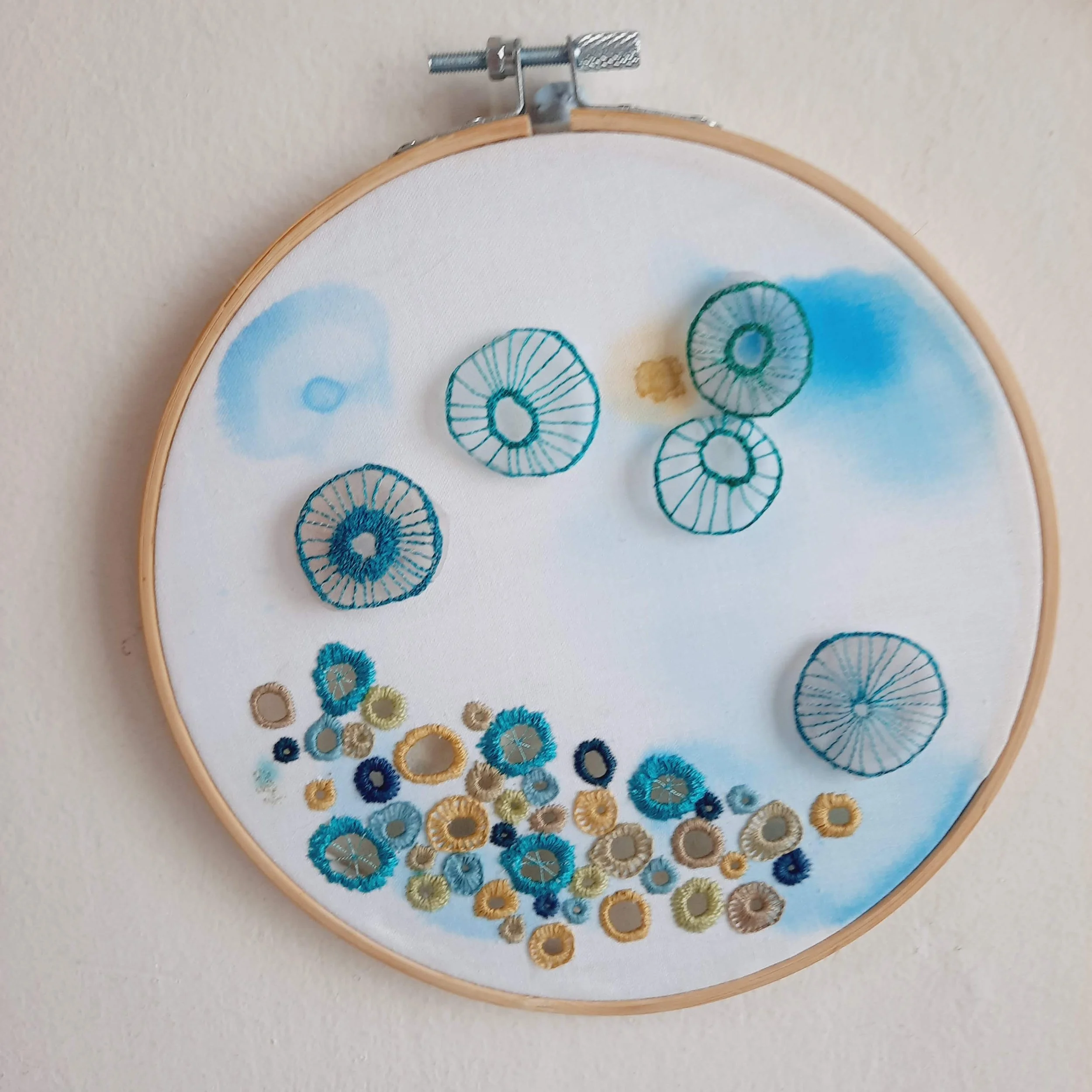 Medium: remnant cotton and organza, bamboo embroidery hoop, thread