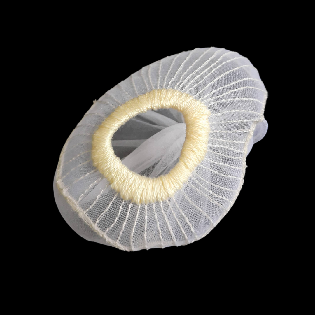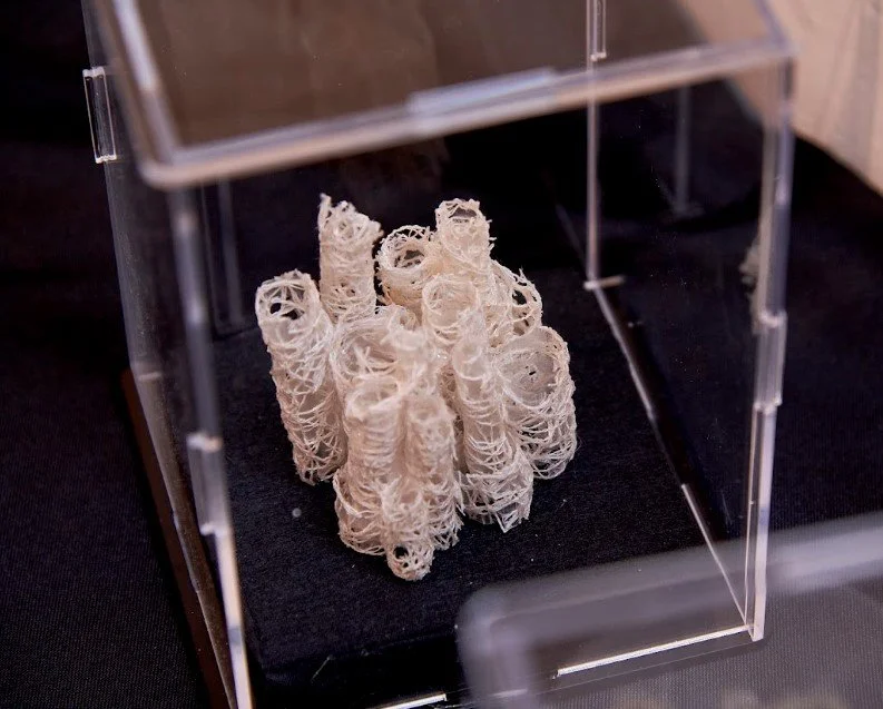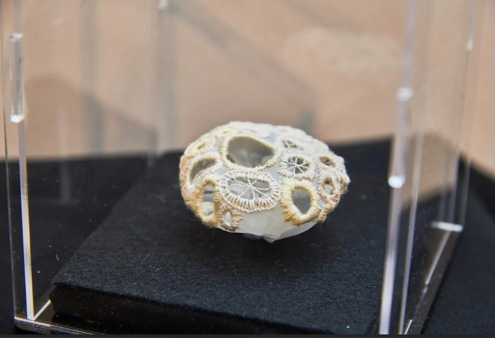 This series of textile artworks that were displayed at the Hues of Loss exhibition transports the viewer to a time when coral reefs may no longer exist due to mankind's voracious consumption. The intricate details of embroidered remnant organza have been crafted to create coral specimens and fossils that are displayed in clear cases reminiscent of a museum showcase. Display these works to deliver a powerful message as they serve as a reminder that coral reefs may become nothing more than historical artifacts.
